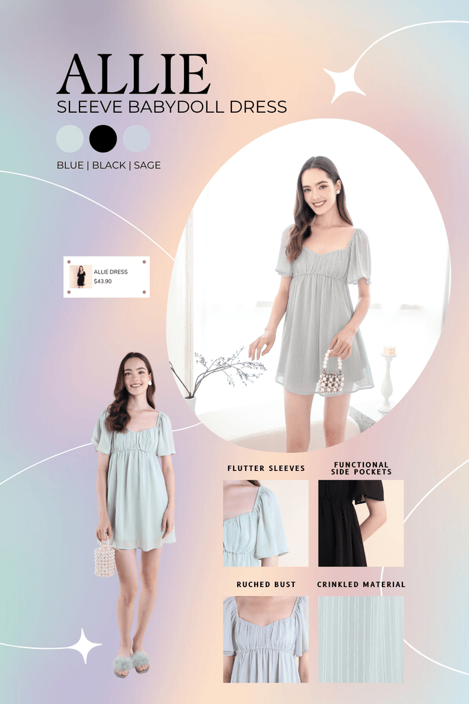 It is love at first sight! Allie combines flutter sleeves and a ruched front detail, in a classic babydoll silhouette. The textures of this dress and its slightly sheer sleeves adds a sweet and romantic touch to the look, making it an extremely lovable one. Allie will be your new favourite babydoll dress!