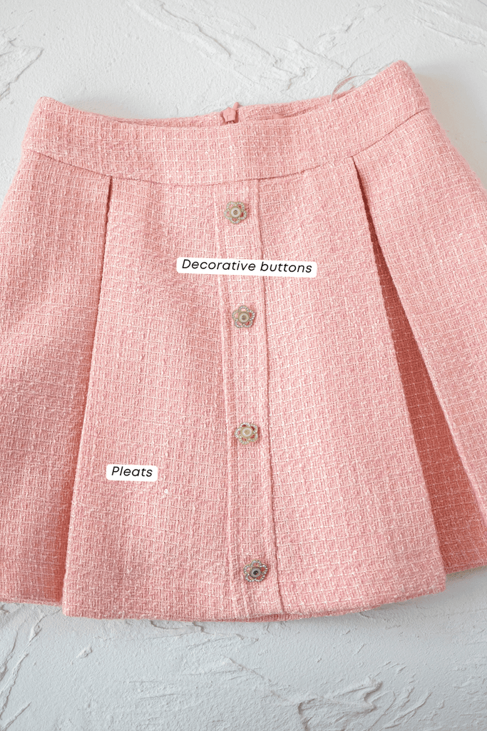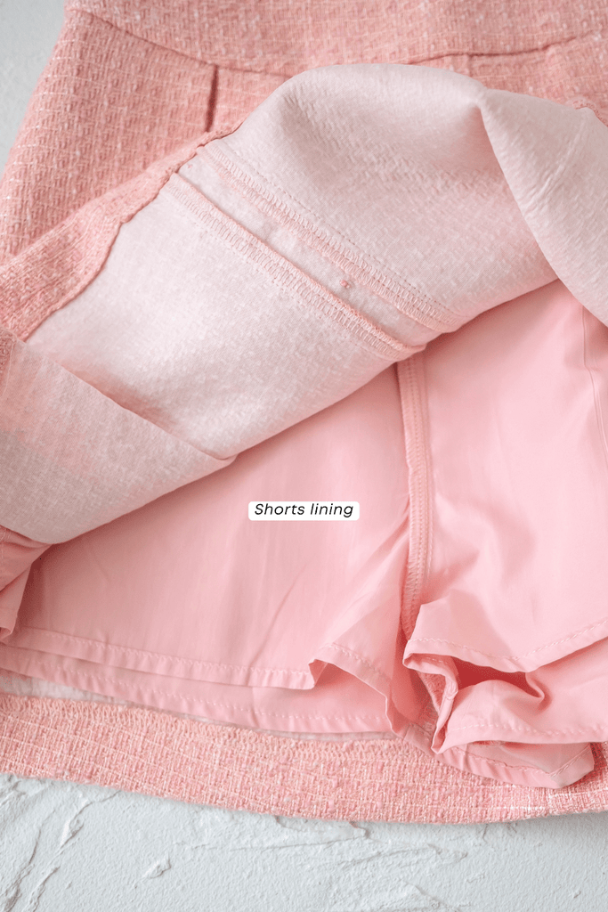 Weaving together the charm of classic tweed with a modern twist. Its soft, pastel hues evoke the sweet whispers of love, while the tailored fit hugs your figure in all the right ways. Perfect for a Valentine’s day date, this set exudes an effortless elegance that’s both cute and captivating, making you feel as enchanting as the day itself.