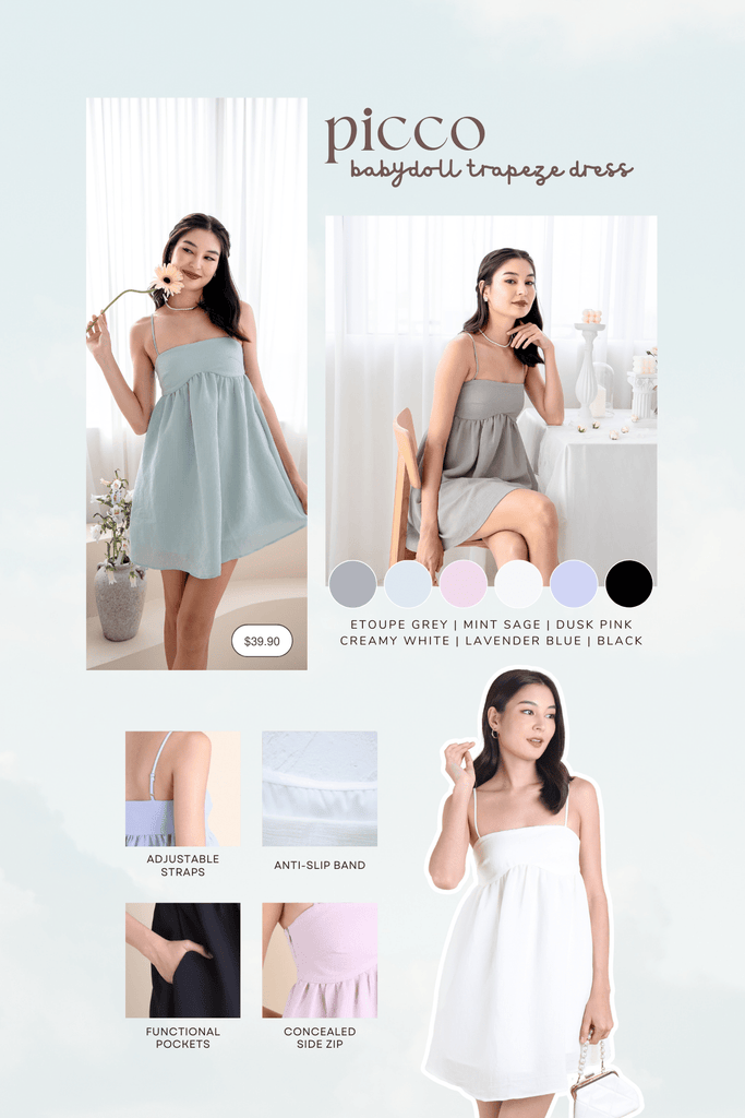 Meet Picco, the perfect babydoll trapeze short dress with delicate spaghetti straps. Available in six stunning colours, this dress is a must-have for any wardrobe. Effortlessly stylish and versatile, Picco is ideal for any occasion.