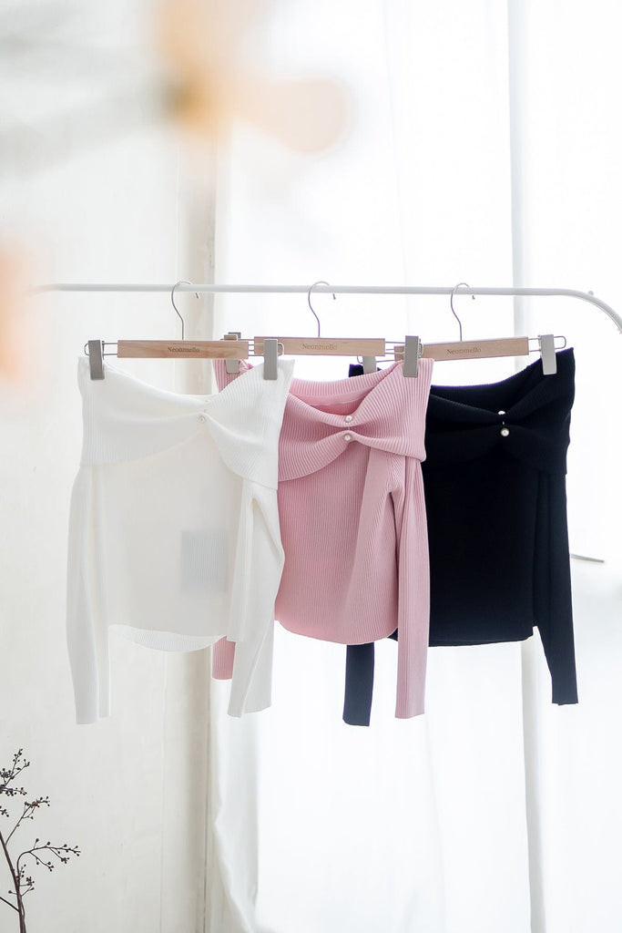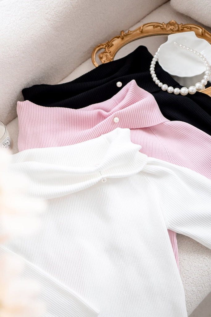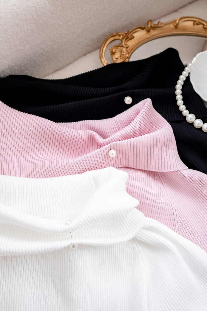 Elegance with its soft, luxurious knit fabric and delicate pearl accents at the neckline. The subtle shimmer of the pearls adds a refined touch of glamour, perfectly complementing the cozy warmth of the design. Ideal for layering or wearing solo, this top is a timeless addition to any sophisticated winter wardrobe.