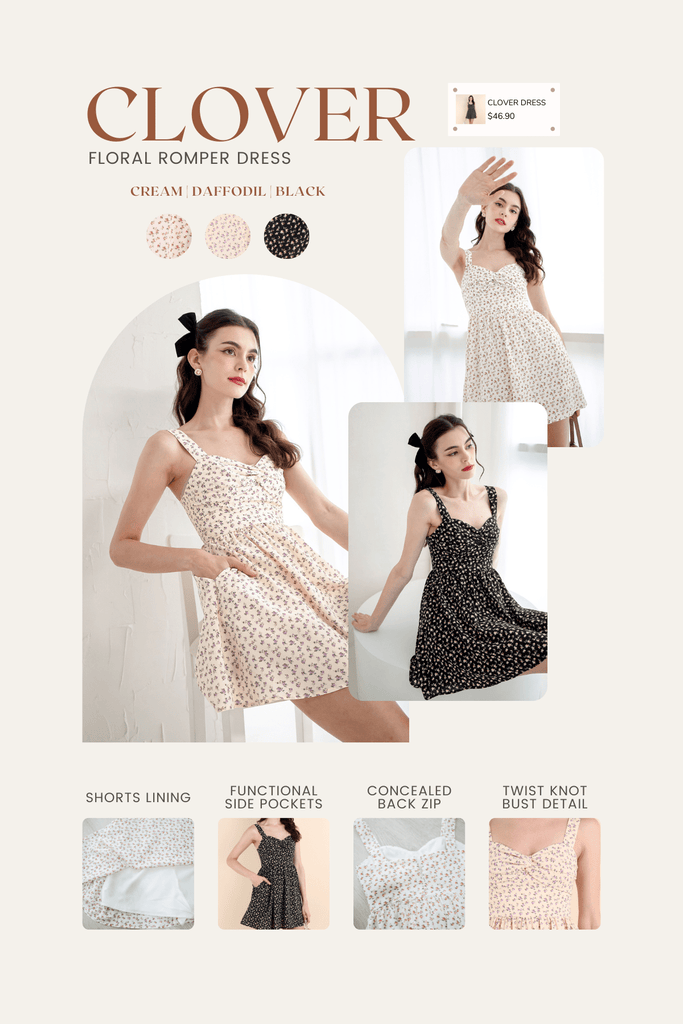 Featuring a twist-knot detail at the bust that goes beautifully well with the gorgeous and delicate florals all over this piece, Clover is an extremely feminine and dainty one! For all our floral lovers, this romper dress is definitely a keeper!