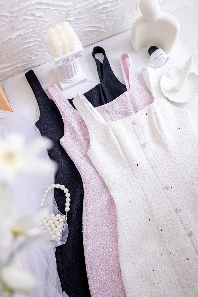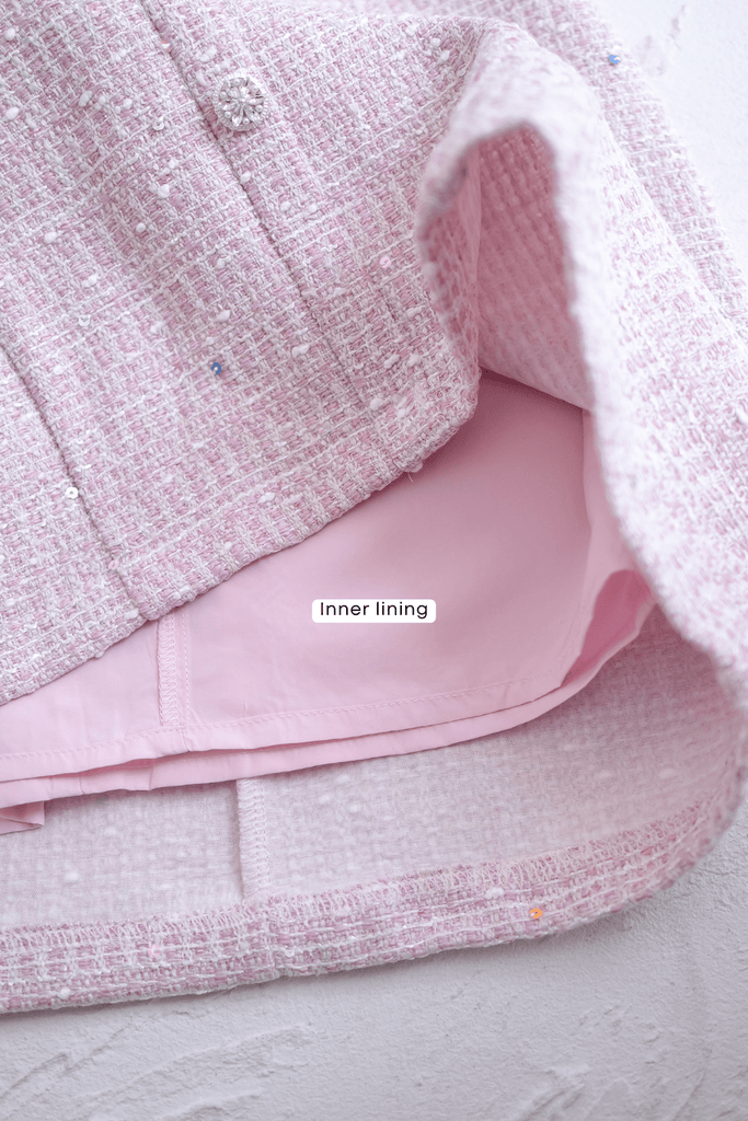 A chic, structured piece that exudes timeless sophistication with a modern twist. Crafted from textured tweed fabric, it features a tailored fit that flatters the silhouette while offering a polished, elevated look. Subtle details like decorative buttons and a clean hemline make it perfect for both daytime events and evening outings.