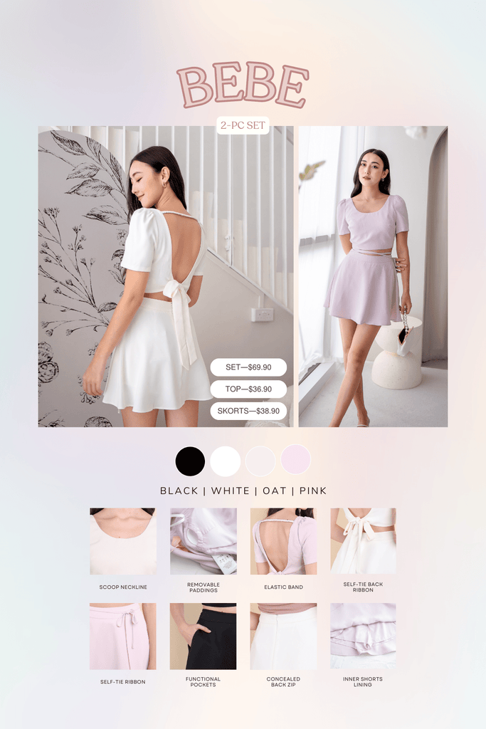 Bebe Set is a stunning ensemble that combines playful elegance with a touch of sophistication. The top features a charming bow detail, while its open back adds a hint of allure. The coordinating ribbon skort is designed to flow gracefully, creating a flattering silhouette that is perfect for special occasions or a stylish night out.