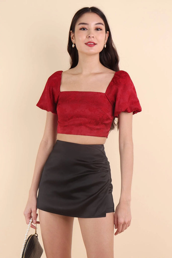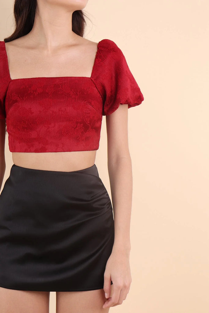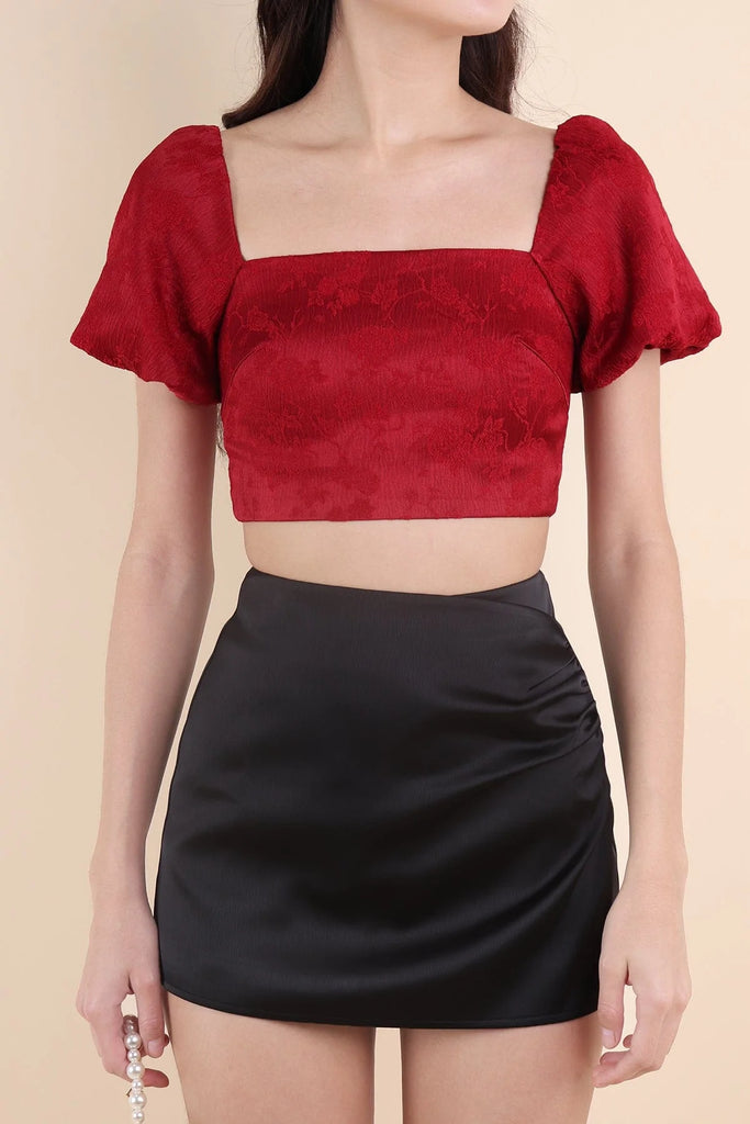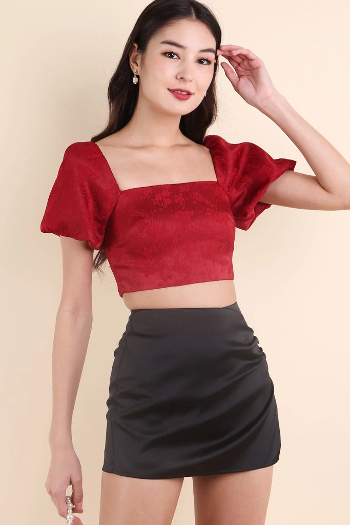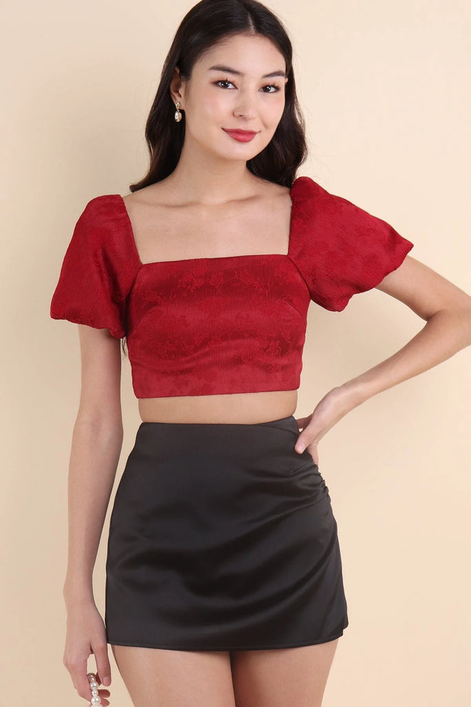 BLOSSOM EMBOSSED PUFF SLEEVE TOP IN WINE RED