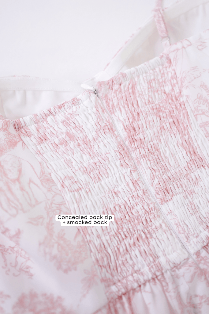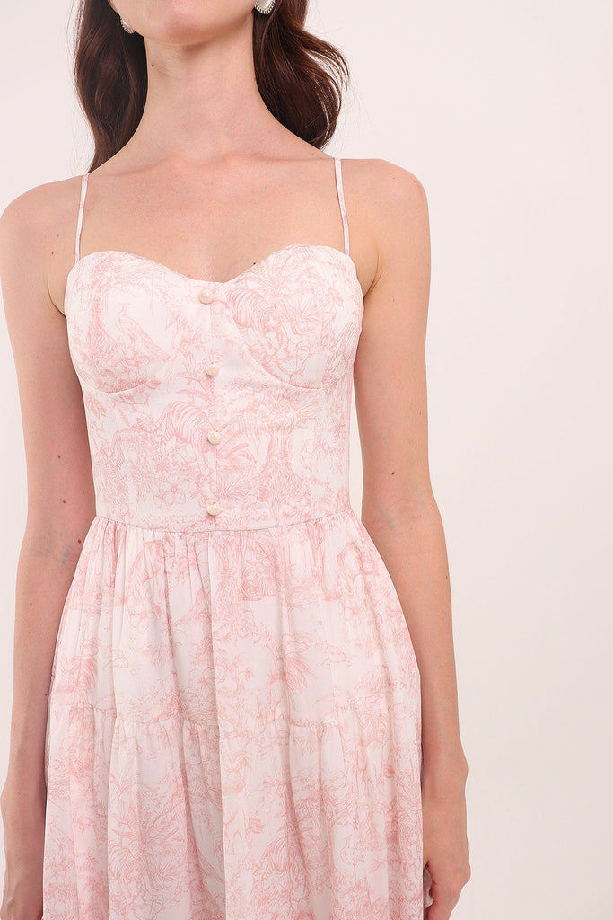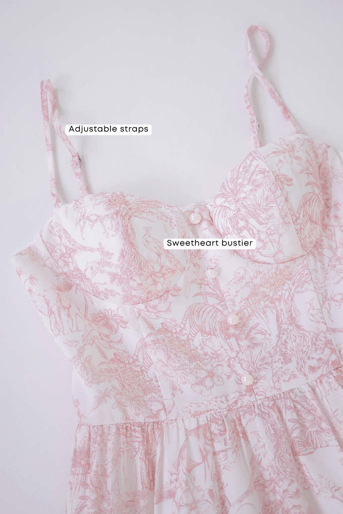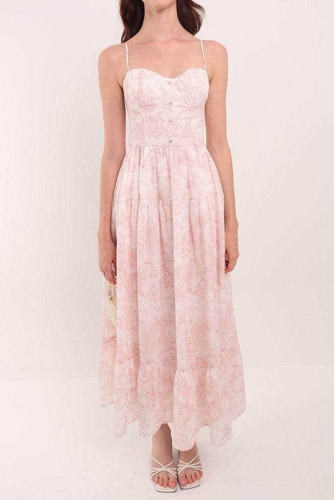 Columbia is a graceful, full-length dress adorned with an intricate toile print that exudes vintage elegance. Built-in padding offers gentle support and shape, enhancing its romantic, flowy silhouette. Perfect for garden parties or elegant day events, it combines timeless charm with effortless sophistication.