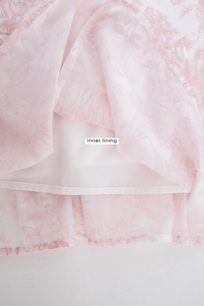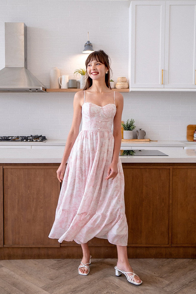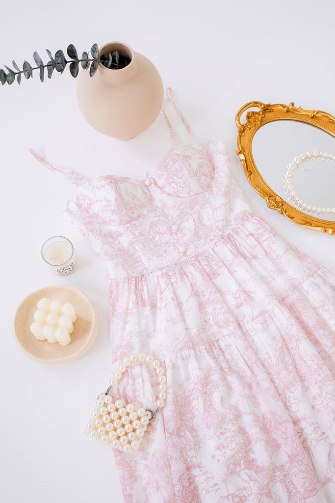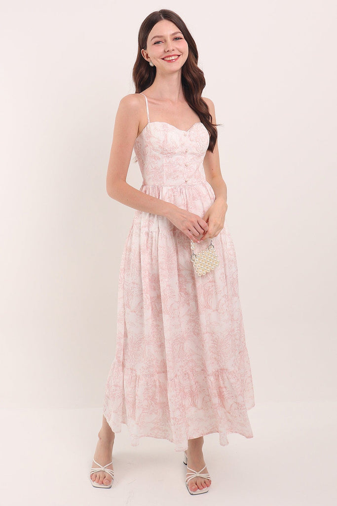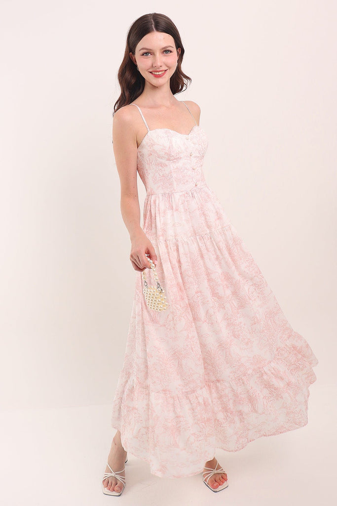 Columbia is a graceful, full-length dress adorned with an intricate toile print that exudes vintage elegance. Built-in padding offers gentle support and shape, enhancing its romantic, flowy silhouette. Perfect for garden parties or elegant day events, it combines timeless charm with effortless sophistication.