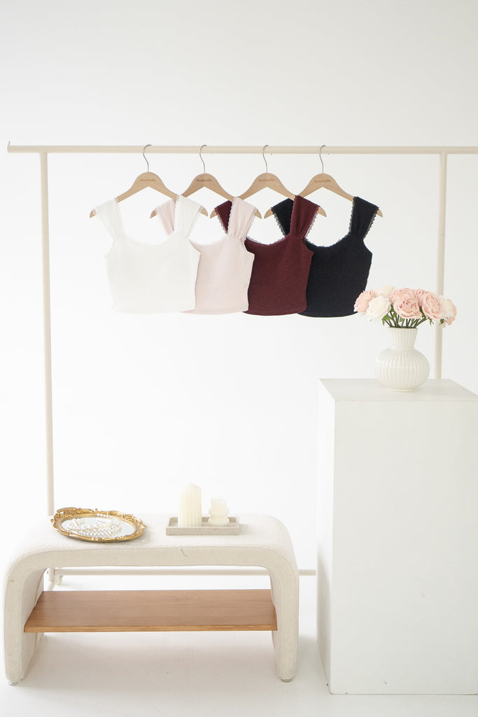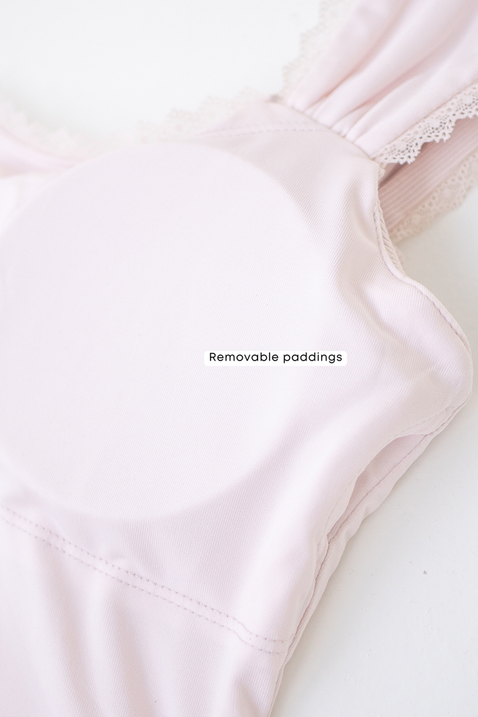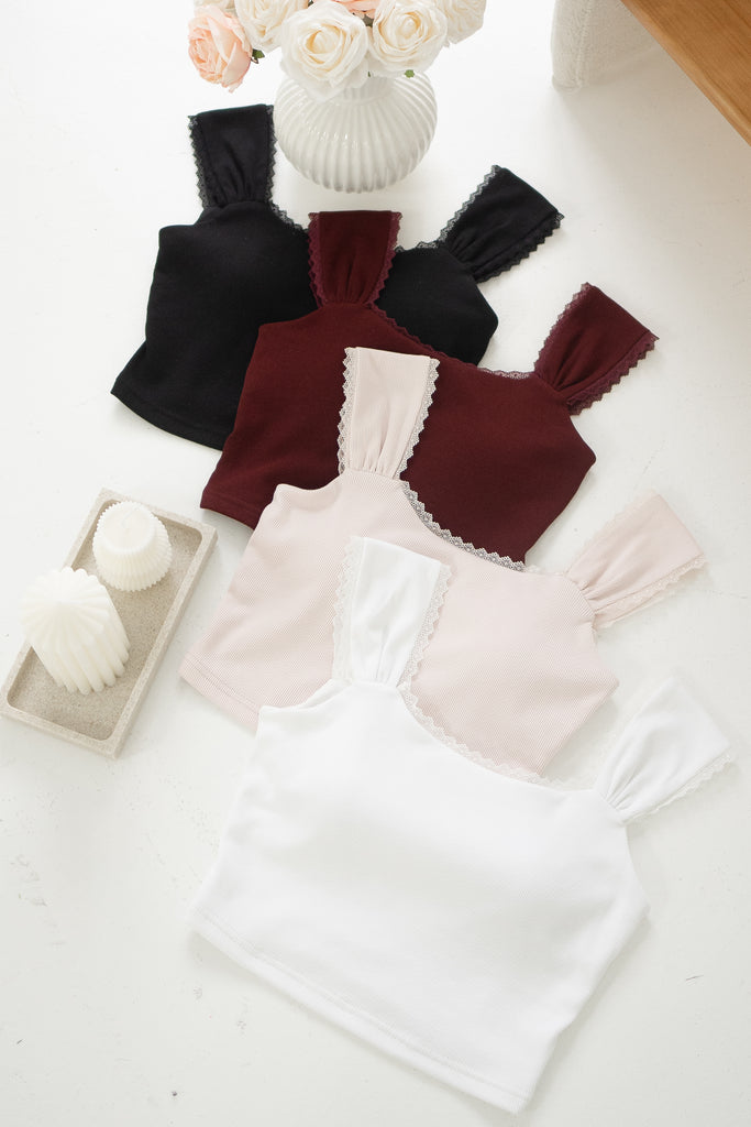 Darla is a romantic, feminine piece featuring delicate lace detailing along the neckline and straps. Designed with built-in padding, it offers comfortable support and a flattering shape without the need for a bra. Its soft, stretchy fabric makes it perfect for both layering and wearing on its own for an effortlessly elegant look.