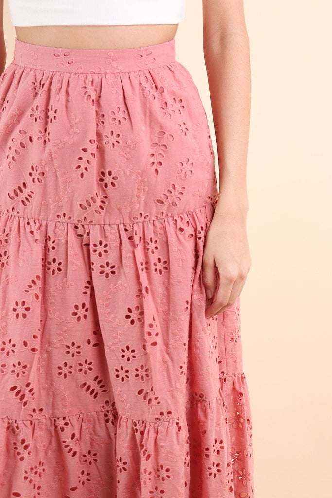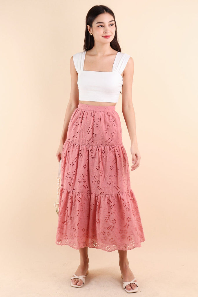 ELYSSA EYELET MIDAXI TIER SKIRT IN ROSE PINK