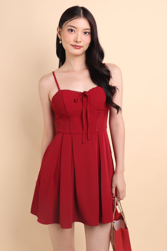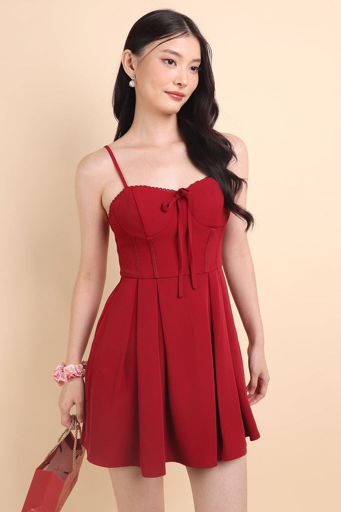 ESTEE PADDED LACE TRIMMING DRESS IN WINE RED