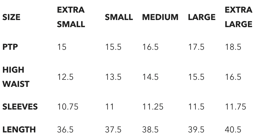 SIZE EXTRA SMALL SMALL MEDIUM LARGE EXTRA LARGE PTP 15 15.5 16.5 17.5 18.5 HIGH WAIST 12.5 13.5 14.5 15.5 16.5 SLEEVES 10.75 11 11.25 11.5 11.75 LENGTH 36.5 37.5 38.5 39.5 40.5 -
