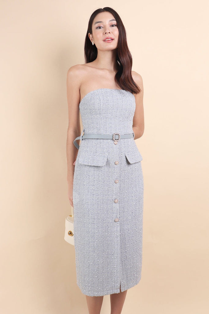 FLORET TWEED BELTED TUBE MIDI IN BLUE