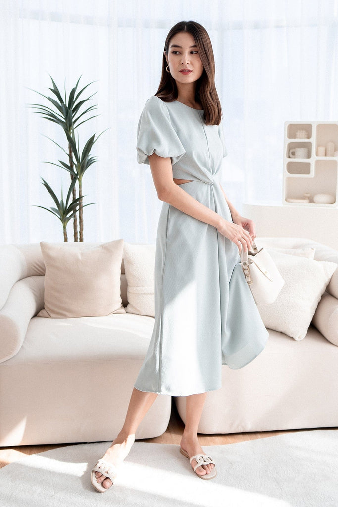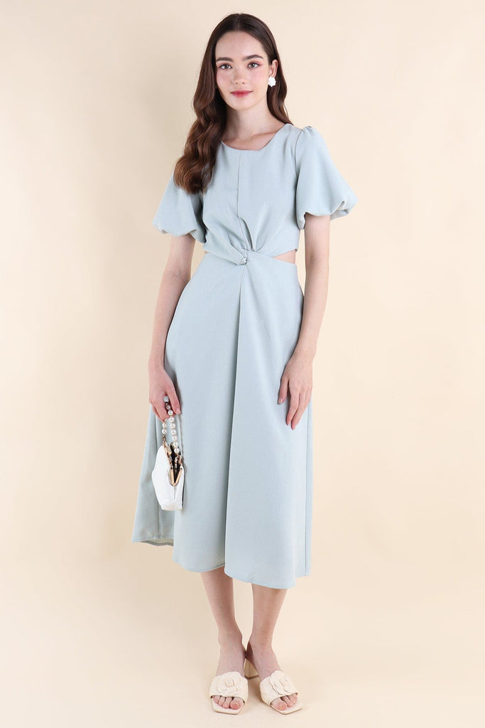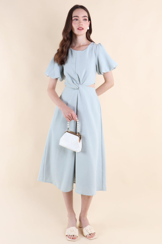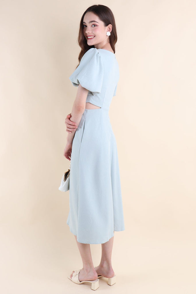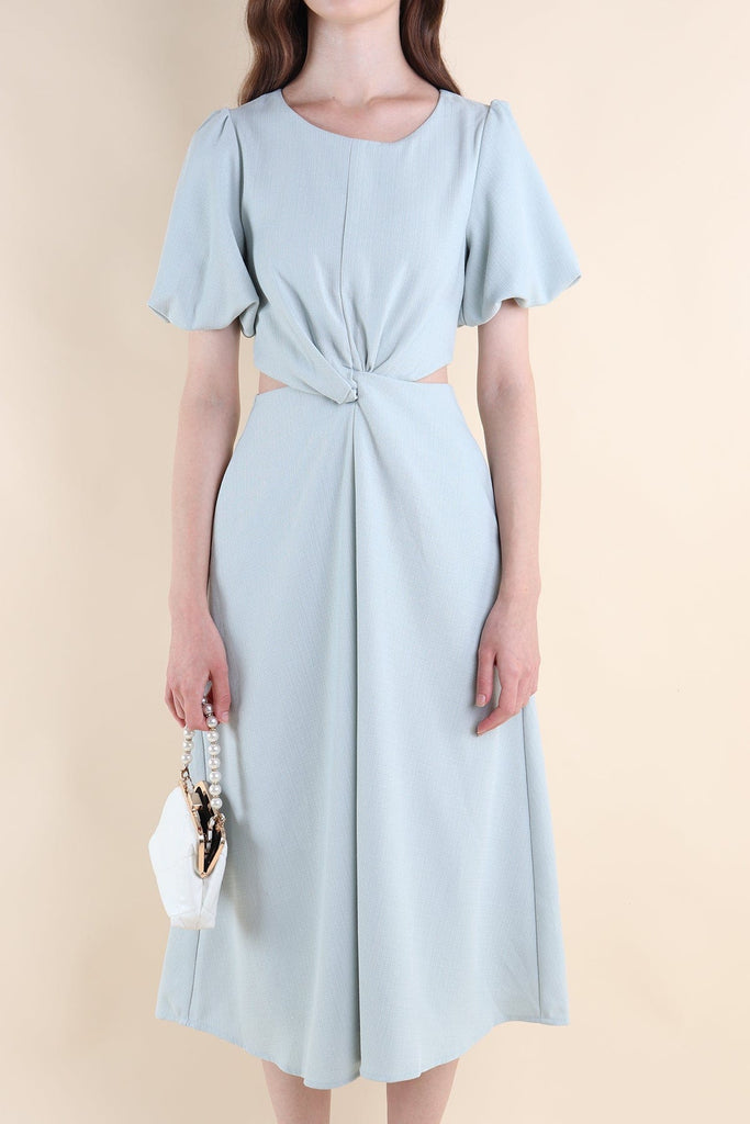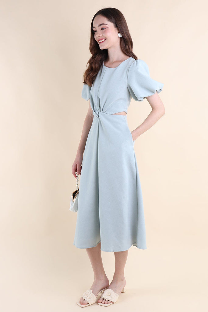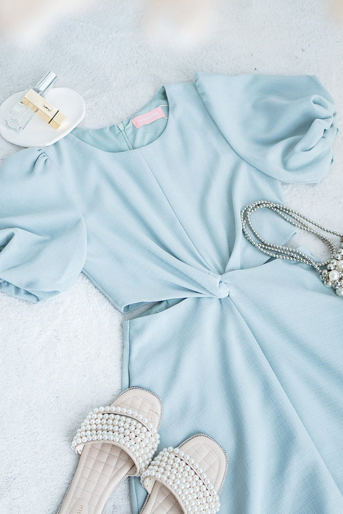 JEVONIA KNOT LINEN CUT-OUT DRESS IN MINT SKY