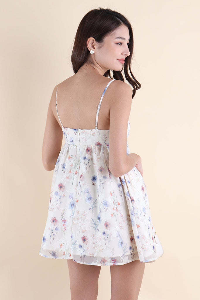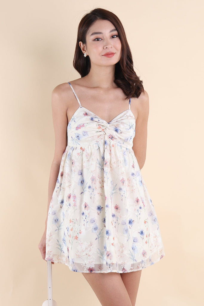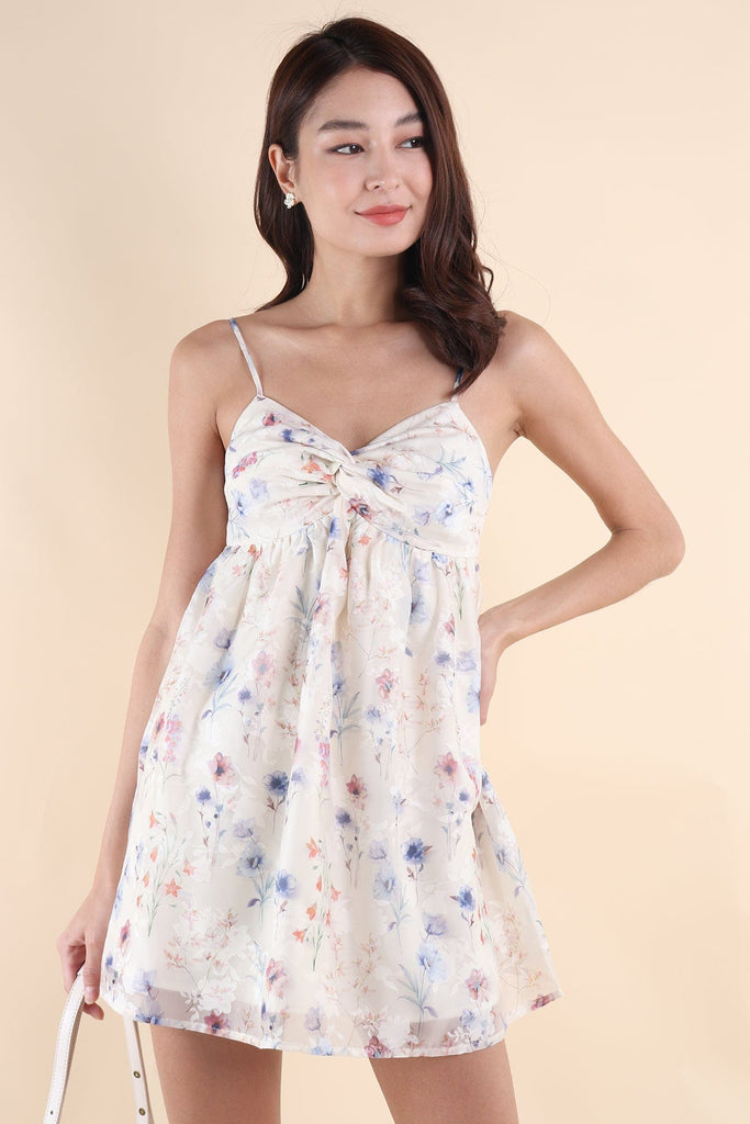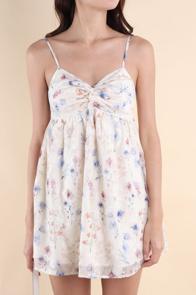 A delightful ensemble where florals dance gracefully, capturing the essence of nature. Kura comes in a mini length and a babydoll silhouette that exudes playfulness and femininity, while its knotted bust adds a sophisticated touch, creating a delicate balance between whimsy and refinement. This piece is a celebration of style, harmoniously blending the timeless allure of florals wrapped up in an enchanting embrace ❀