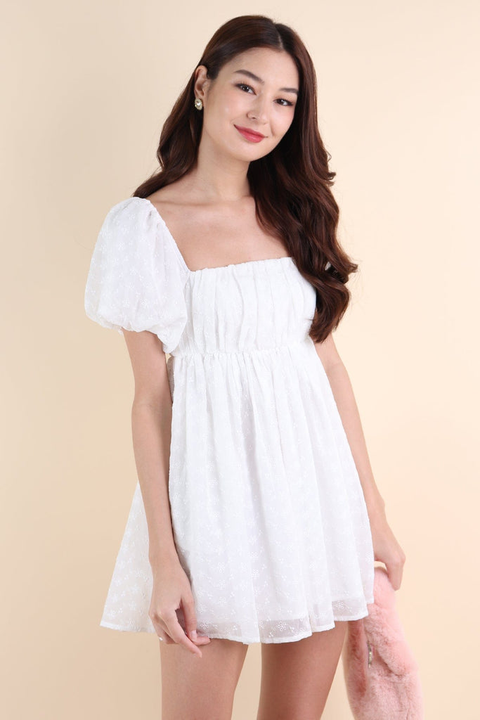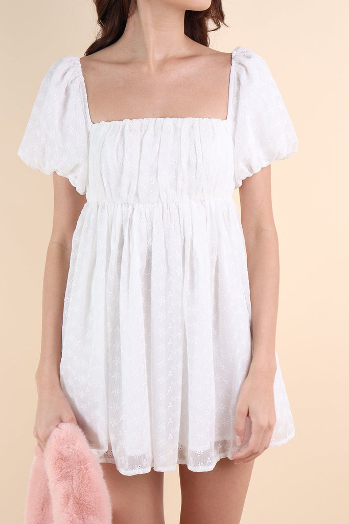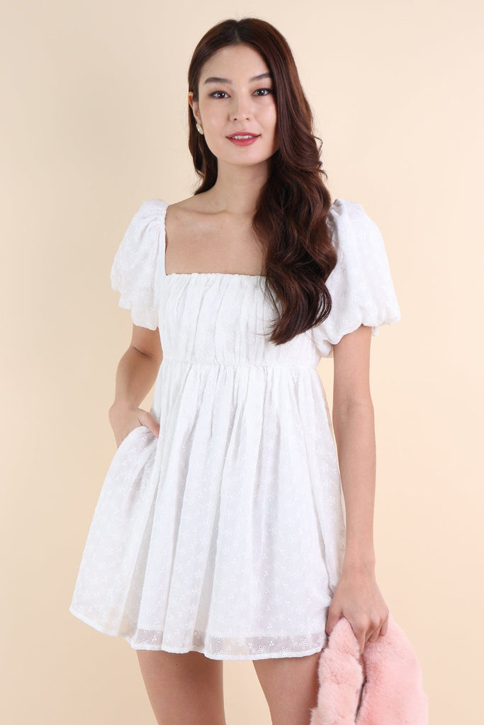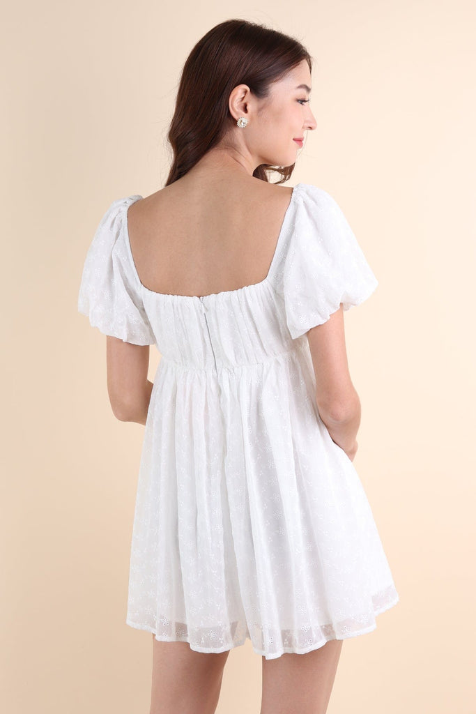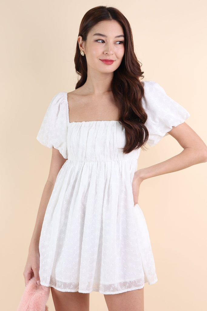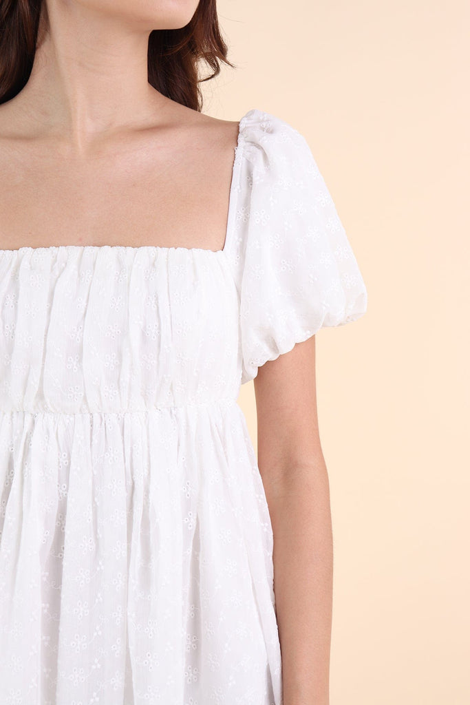 KYRIE PUFF SLEEVE RUCHED EYELET DRESS IN WHITE