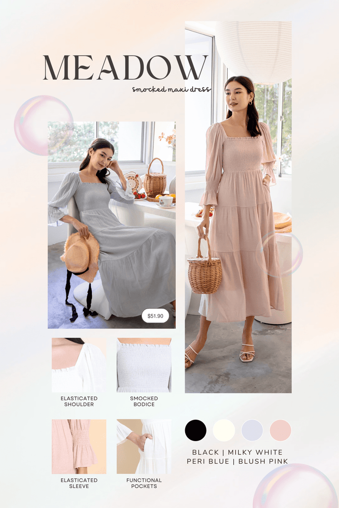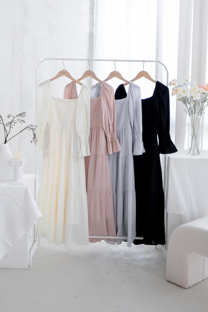 Meadow showcases a charming smocked bodice complemented by long sleeves, offering both comfort and style. Available in a palette of four rich colors, it exudes versatility and elegance for any season. Perfect for both casual outings and formal events.