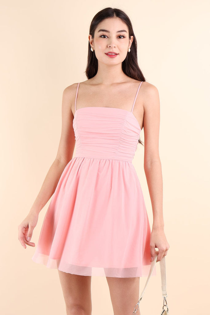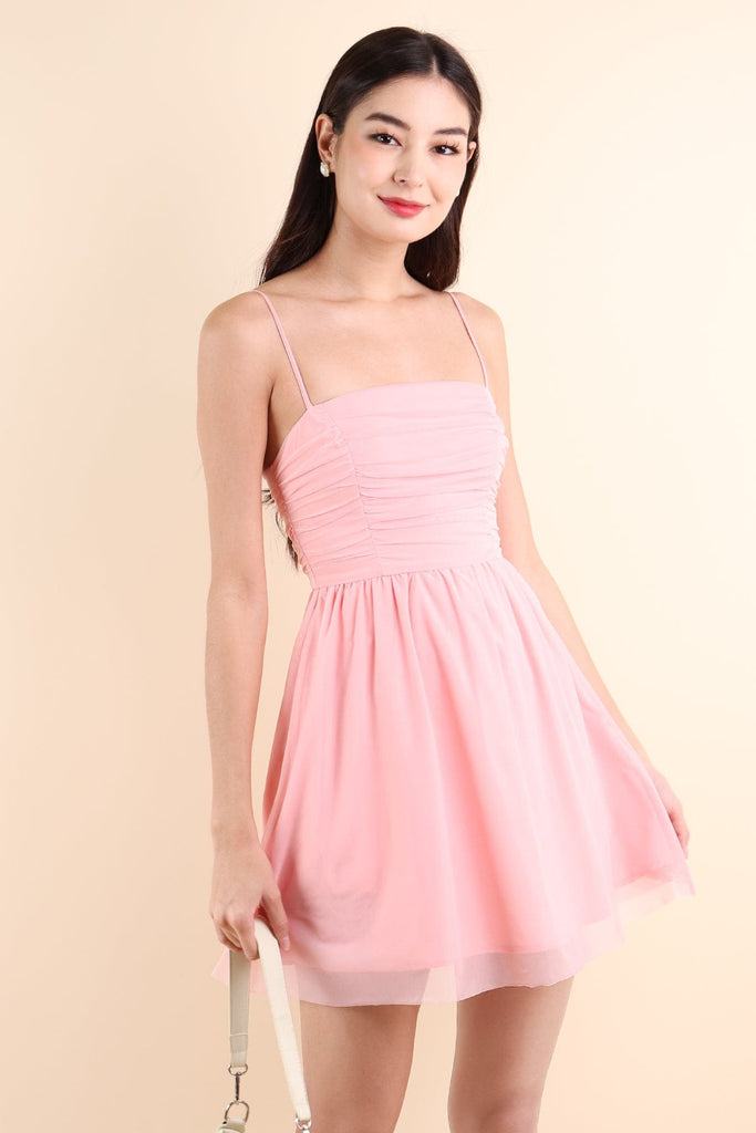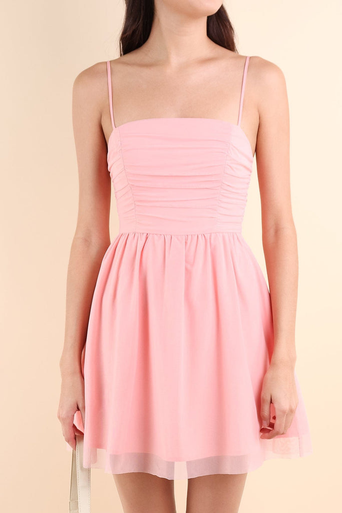 PAISLEY RUCHED MESH ROMPER DRESS IN PINK