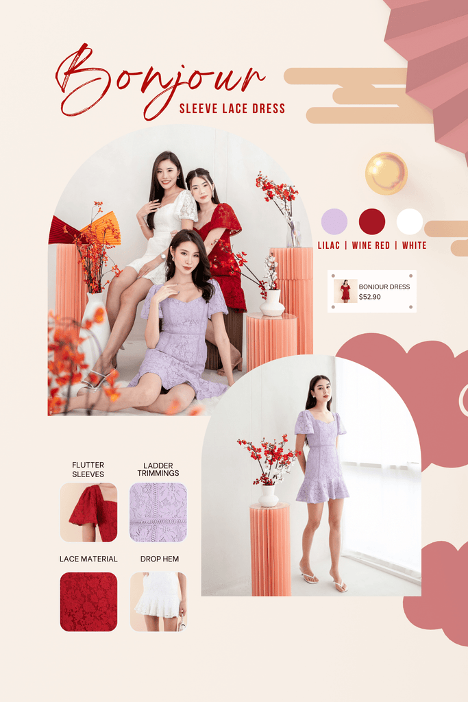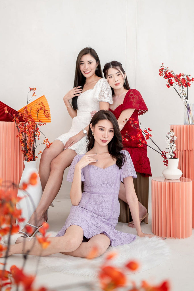 Bonjour features a sweetheart neckline with elegant flutter sleeves. The dress is fully lined except its slight see-through sleeves, a lovely mix of lace and sheer! Not to forget the intricate ladder and crochet trimmings detail! Bonjour is great for not just CNY, but for date nights too!
