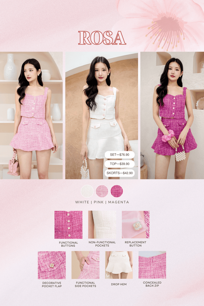 Rosa Camellia set is a chic and playful ensemble that blends sophistication with a touch of fun. The textured tweed top, with its subtle accents, adds a refined charm, while the matching skorts offer comfortable fit. This set is perfect for those who love a polished, yet relaxed look, ideal for both casual outings and dressed-up occasions.