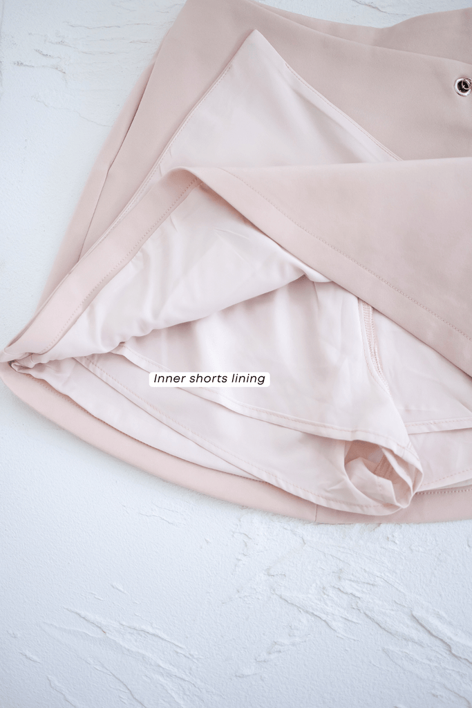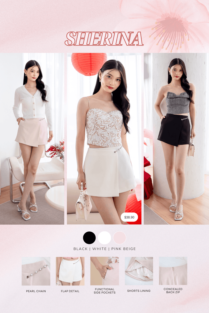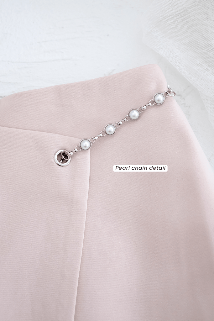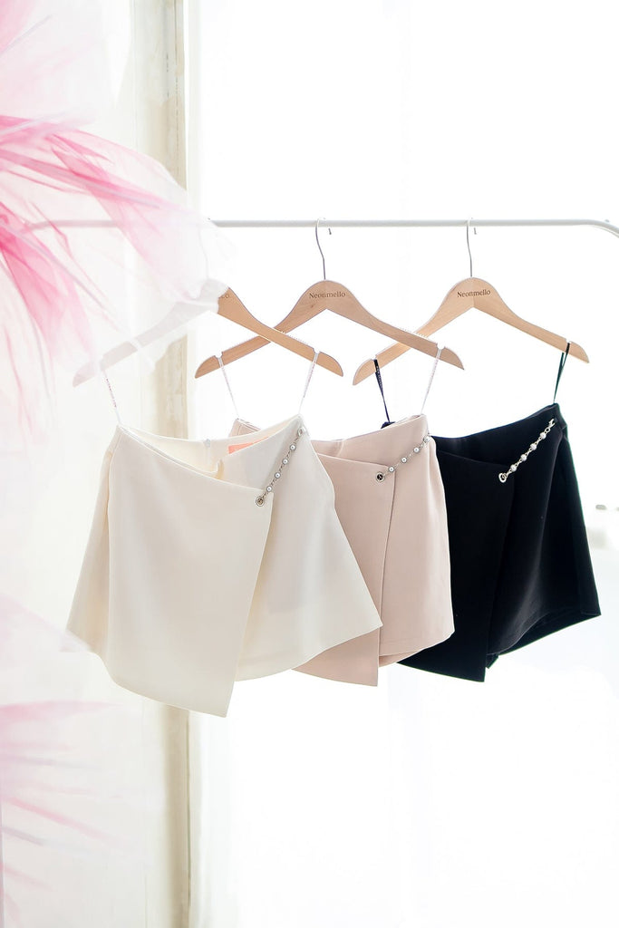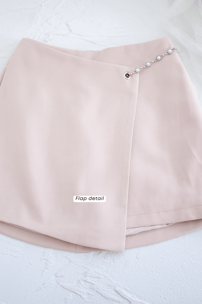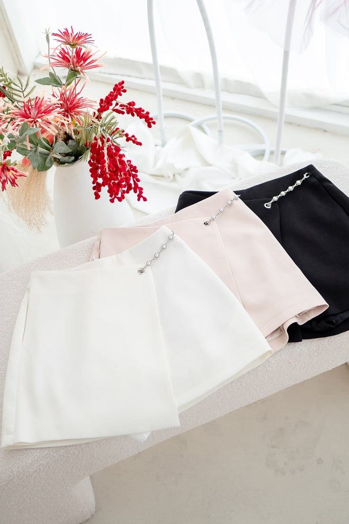 Sherina exude a refined elegance, with lustrous pearls delicately draped along a chain that glimmers like precious gems. The soft, silky fabric drapes gracefully, while the flap design adds a touch of sophisticated movement, reminiscent of the gentle ebb and flow of the tide. A perfect balance of timeless beauty and modern charm, this skorts are an ode to the understated of pearls, adding a radiant touch to any ensemble.